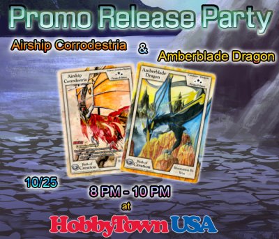 Illustrated by new artist Wes, these watercolor cards will make an exciting addition to any Dragon or Angel deck. This Promo Release Party will be held in Fresno, CA, at HobbyTown USA off Barstow and Blackstone. The event is Open House from 8 PM - 10 PM, and you'll get an Amberblade Dragon just for showing up! Even if you're not interested in the mechanics of the first ability creature ever created in Exodus, you'll want to see how these paintings went from Canvas to Card. That's right, the original paintings will be on display at HobbyTown for this event, and you'll have a chance to play a game with Wes or the creators! Don't live close enough to attend? Don't worry, there will be several opportunities online or at your local game store for you to obtain your own copies of these cards.