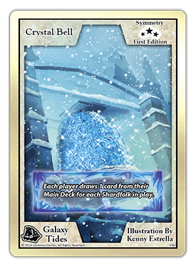 Crystal Bell gets this month's card spotlight, and for good reason, too. It's one of the harder cards to pull from the Galaxy Tides booster pack and is the card that everyone is talking about. Well, everyone who is playing Shardfolk! It's effect reads, "Each player draws 1 card from their Main Deck for each Shardfolk in play." What amazing draw power! The possibilities are literally endless with the potential for how many cards you could draw. As long as you focus your efforts on summoning tons of ice creatures, you could be drawing 4, 5, 9 or more cards per turn! Your opponent also gets to draw that many cards, so playing it strategically is key. With lots more support coming for Shardfolk next set, there will be even more options for our frozen friends. This card has helped make Shardfolk decks known as the Draw Decks, and provides more than enough in those terms. This means you can expect