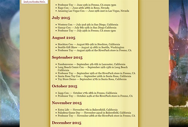 Conventions RecapFresno Con --- January 31st-February 1st in Fresno, CAStrategicon --- February 13th-16th in Los Angeles, CA Long beach Comic Expo --- February 28th-March 1st in Long beach, CA Ani-ME Con --- March 21st-22nd in Fresno, CA Big Wow Comicfest --- April 18th-19th in San Jose, CA Yummecon --- April 25th in San Jose, CA Kublacon --- May 22nd-25th in San Fransisco, CA Amazing Las Vegas Con --- June 19th-21st in Las Vegas, NV Rage Con --- June 26th-28th in Reno, NV Western Con --- July 2nd-5th in San Diego, CA Gam3r Con --- July 8th-12th in San Diego, CA Stockton Con --- August 8th-9th in Stockton, CA Seattle Gift Show --- August 15-18th in Seattle, WA We loved meeting every single one of you at these recent conventions and had a blast seeing the unique decks you came up with! Some highlights included the biggest Exodus booster draft we've held to date and some very excited Constructed Tournaments. We were also honored to sign so many cards on request. We look forward to seeing you at more events soon!