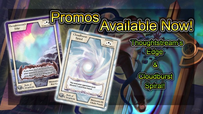 If your strategy is all about card advantage or if you find your opponent's hand full of cards and yours empty, Cloudburst Spiral causes you and your opponent to each discard 1 card from hand. Keep in mind they can still use their Symmetry cards in response, but it may be just the thing to get rid of that pesky Timeless Angel of Eternity. What a sweet play if you have nothing to discard! Look for these new promos at tournaments, contests and events.