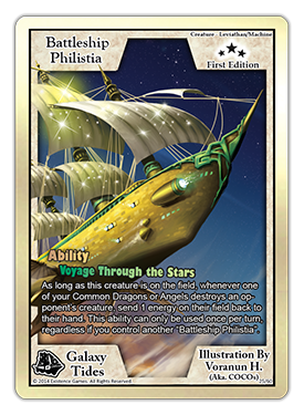 It's a Machine/Leviathan type creature, with the effect: As long as this creature remains on the field, whenever one of your Common Dragons or Angels destroys an opponent's creature, send 1 energy on their field back to their hand. This ability can only be used once per turn, regardless if you control another "Battleship Philistia". In short, you can send an energy on your opponent's field back to their hand when one of your 1-star Dragons or Angels destroys a creature! Imagine if they have any weak 1-energy creatures in play; you can destroy one of their bigger ones, and then send the 1 energy back to their hand, which will destroy their creature and leave them open for a direct beat-down! Just in case you didn't notice, this card goes great in a Dragon/Angel deck and will be a massive threat the second it hits the table. We saw some amazing Battleship/Drangel decks coming together at the Pre-Releases and can't wait to see more of what it can do! If you love the Living Ship/Leviathan theme, you'll get another new flying ship Ability creature "Airship Corrodestria" just for Pre-Ordering your Starter Decks at your local game store!