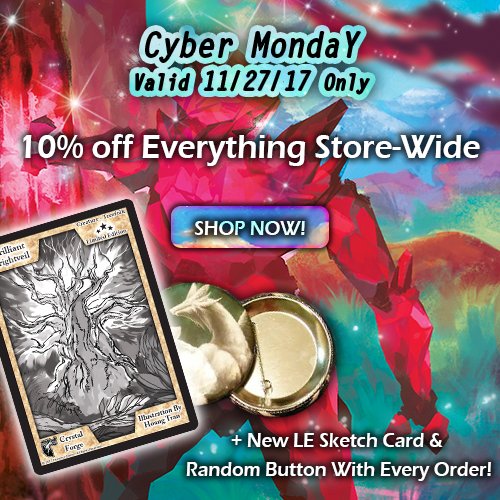 Exodus News, Extra Issue #010 -- Cyber Monday Deals!Hey gamers! The holiday season is now upon us, and that means lots of shopping, and--even more importantly--lots of deals! Don't miss out on our Cyber Monday deal in the Exodus Online Store, because it's your one chance to snag a deal like this! A Never-Before-Seen Sketch Card!Get this: only 8 different cards from set 3 (Crystal Forge) were printed in a LE Sketch version... 7 of those were randomized in the First Exodus Magazine Issue along with four different Galaxy Tides sketch cards. But that leaves 1 of the Crystal Forge sketch cards unused and unavailable--until now!! For one day only on 11/27/17 you can get this 8th CF sketch card for FREE with any order in the Online Store, along with 1 randomized Exodus button pin!Cyber Monday is the perfect time to grab any of those Exodus products that you've had your eye on, because everything in the store is also 10% off!