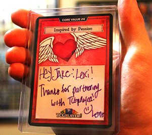 TCG PlayerFollowing our ICV2 interview, several employees from the popular site known as TCG Player found their way to our booth at GenCon, and after a few thrilling matches and conversations, we found ourselves shaking hands with these guys who were not only new pals, but new partners as well. Now, the Exodus TCG is up and live on TCGplayer.com and ready to rumble! We highly encourage you to check it out :) The folks at TCGPlayer have been nothing but wonderful to work with, and we couldn’t be more appreciative of how efficiently they do business and communicate. (And thanks for the swag guys!)