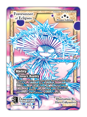 Card Name: Forerunner of Eclipses Type: Creature - Shardfolk/Mushfolk Ability: Invert Reality - Once per turn, you may activate this Ability to summon this creature from your hand to your field. If you do, you may target 1 effect or Ability on the stack and that effect becomes "each player draws 1 card".