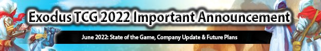 We first and foremost want to apologize for our recent silence and lack of official game announcements, and realize that an update is long overdue. We’ve been keeping up to date with our community Discord chat, emails and social media comments, and truly appreciate everyone’s support, care and continued love of the Exodus TCG. Your passion and support means the world to us. It’s not our desire nor intent to leave you in the dark and thus we have some information on the current state of the game and its future. This announcement has been planned for some time. And although it has been delayed or postponed at times for various reasons, we know it’s time to address the community’s concerns.